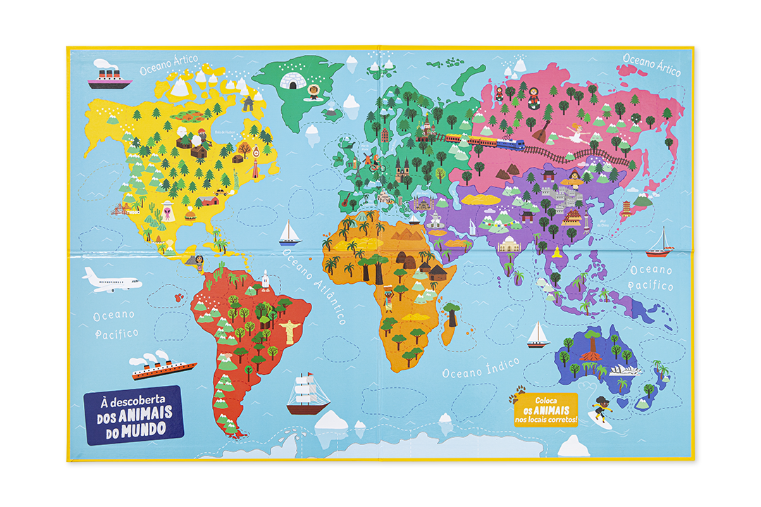 - Caixa com um livro informativo ilustrado com 64 páginas, 1 tabuleiro magnético com o mapa mundo; 119 ímanes e uma bolsa em plástico para guardar os ímanes.