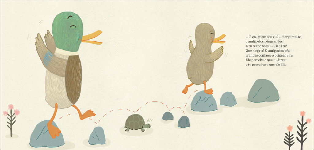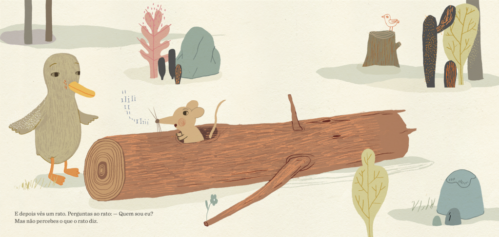 Este simpático pato castanho carrega uma mochila. Tem de partir para longe, aprender a conhecer um lugar novo e também estranho, onde ninguém o entende nem sabe quem ele é. Encontra uma mosca, um peixe, um rato, e pergunta-lhes: “Quem sou eu?” E, pouco a pouco, brinca com eles, sorri e gosta de ali estar.