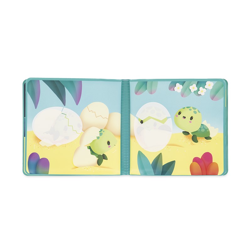 Vamos mergulhar o livro na água e olhar com muita atenção, vão aparecer algumas surpresas! No final, basta secar o livro com imagens sobre as amigas tartarugas marinhas, que depressa voltam a esconder-se no seu esconderijo.