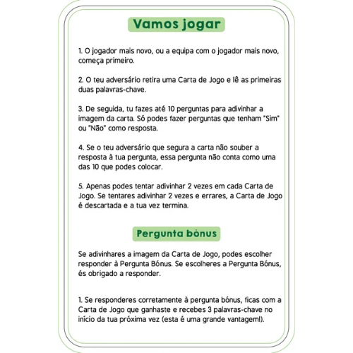 Prepara-te para jogares o mais entusiamante jogo de perguntas de sempre! Faz até 10 perguntas para adivinhares o animal que está na Carta de Jogo! É um carnívoro? É um animal doméstico? Vive em grupos? Pensa bem, faz perguntas inteligentes, usa as tuas Cartas de Pista de forma sábia, e sê o primeiro a ganhar 7 Cartas de Jogo. Vamos começar?