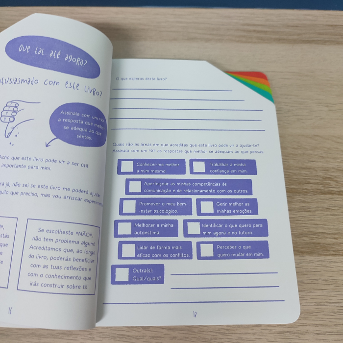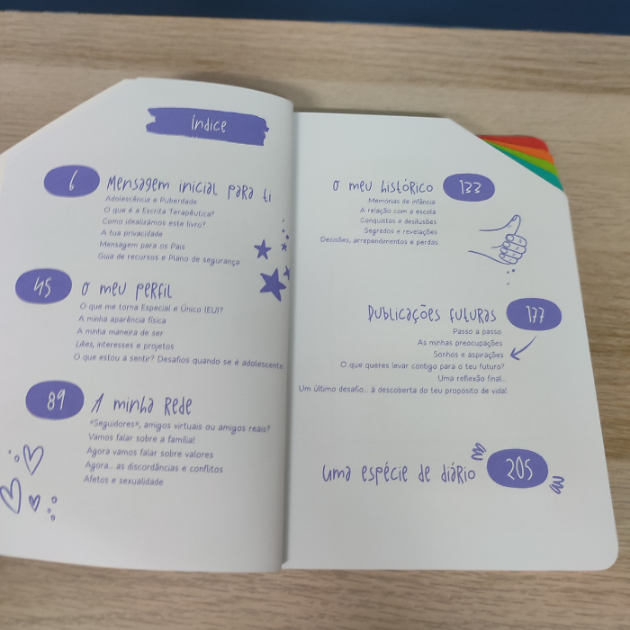 Dividido em cinco partes com diferentes cores para facilitar a consulta, aborda temas que vão desde o autoconhecimento, à rede de relações e a atividades para te compreenderes e desenvolveres ferramentas úteis para viveres uma adolescência mais tranquila, com menos ansiedade.