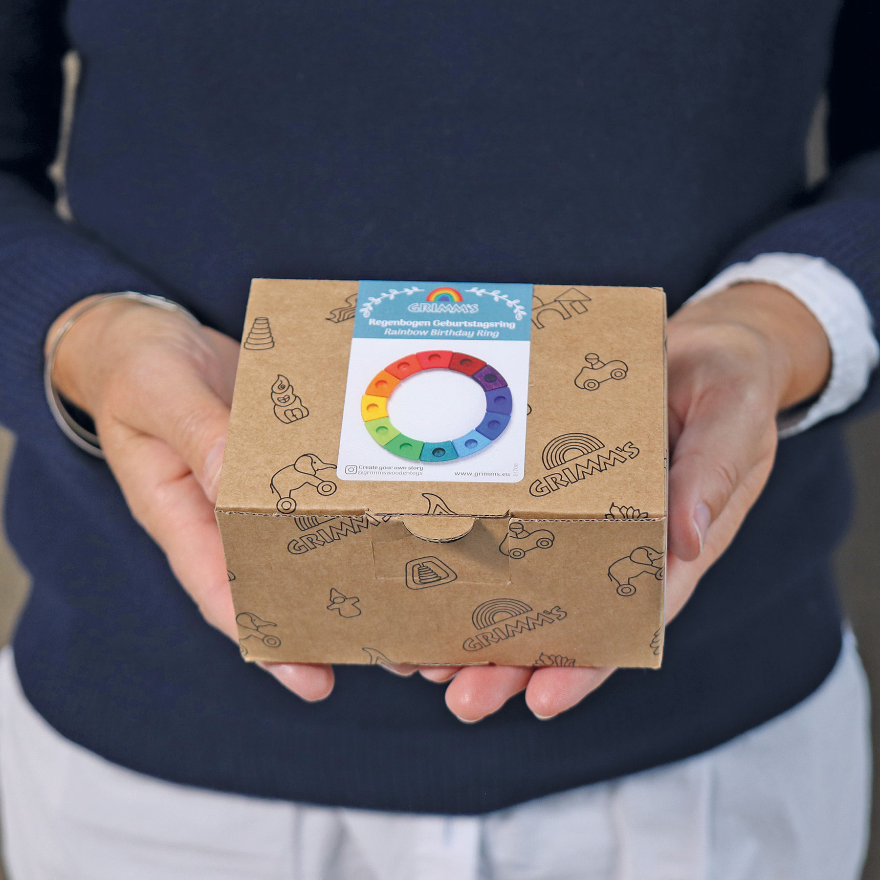 É composto por doze segmentos, com 1 furo cada, os quais podem ser usados todos juntos, individualmente ou em grupos. O Anel de Madeira pode ser complementado com outros elementos que são vendidos separadamente, desde velas, números, figuras representativas dos meses do ano ou figuras do calendário de madeira Grimms, por exemplo.