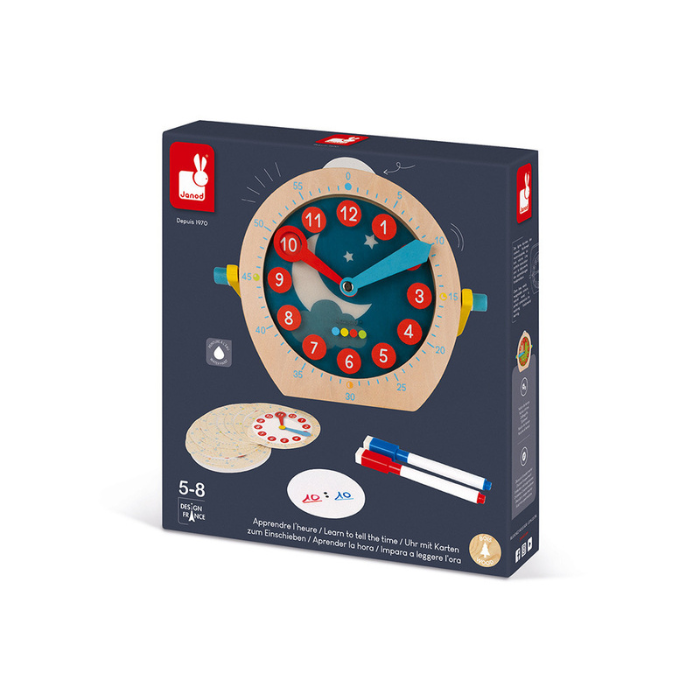 Contém: 13 cartões modelo com formato digital de um lado e formato analógico do outro para familiarizarem-se com os 2 sistemas de leitura, 1 cartão modelo apagável em branco para escrever outras combinações usando os 2 marcadores fornecidos [vermelho para as horas e azul para os minutos], 6 cartas para deslizar na ranhura do relógio [dia | noite e 4 cartas para melhor visualizar as noções de 15, 30, 45 e 60 minutos].