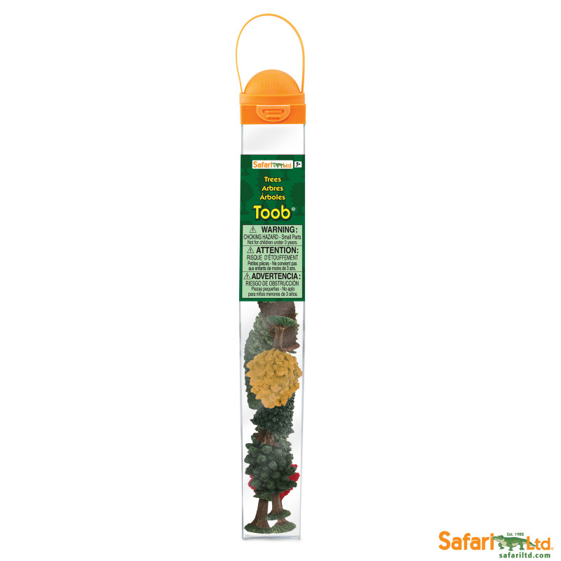 Tubo com 9 figuras de diferentes espécies de árvores, em miniatura.