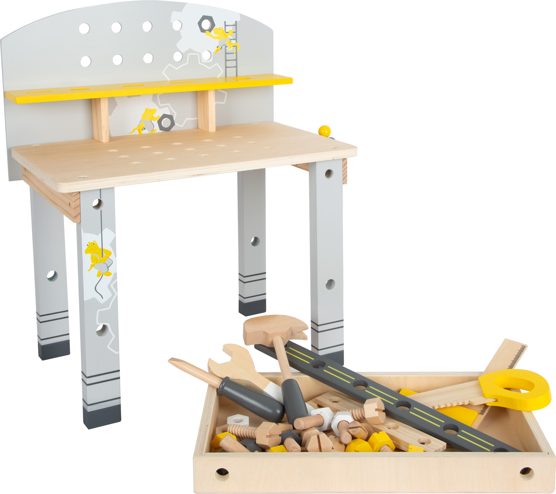 - Contém: 1 bancada de trabalho, 1 morsa, 3 perfurações, 1 vara de medição, 1 serra, 2 chaves de fenda, 1 martelo, 5 parafusos, 5 porcas e 3 pregos de madeira.