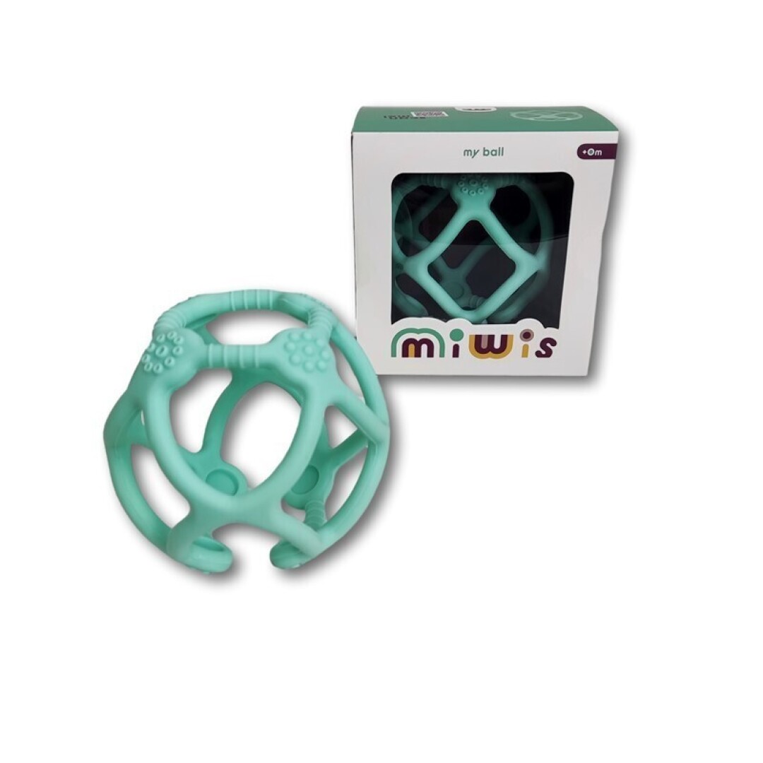 A Bola Mordedora em silicone, com a cor azul turquesa da Miwis, tem várias texturas que estimulam as habilidades motoras dos exploradores mais pequeninos e ajudam a aliviar o incómodo do crescimento dos dentes.