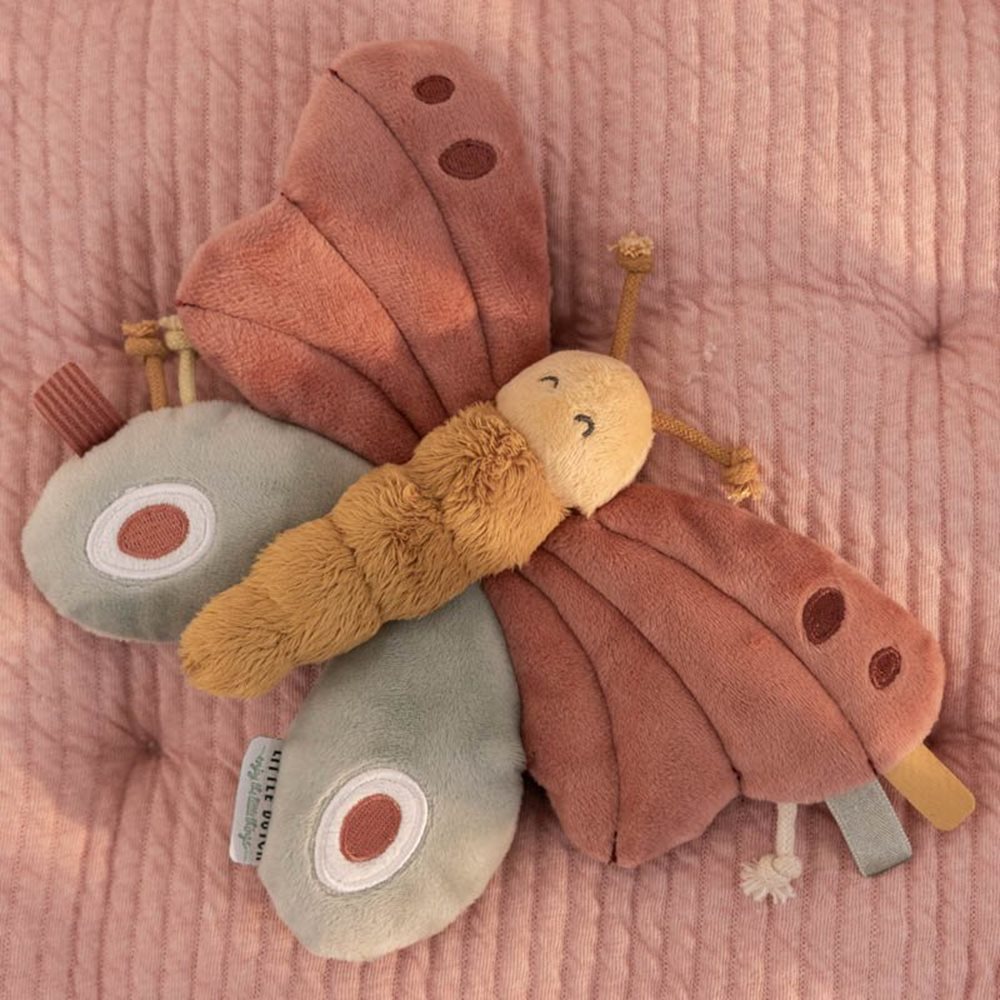 As suas asas enrugadas, os vários nós e etiquetas coloridas, vai despertar a curiosidade dos exploradores mais pequeninos! Por ser macia e pequena, é ideal para as primeiras brincadeiras.