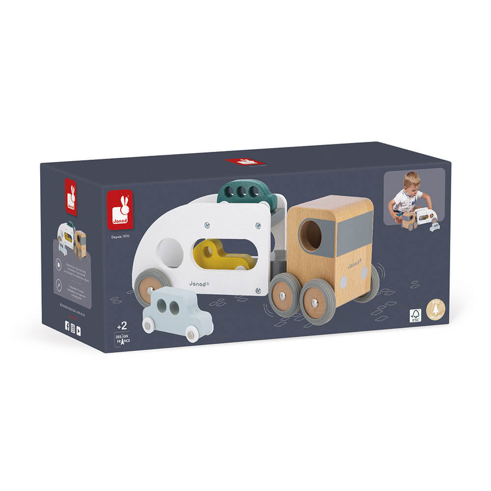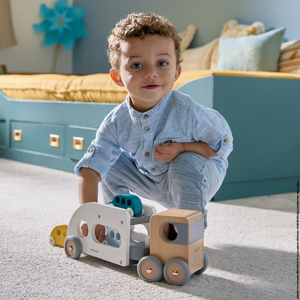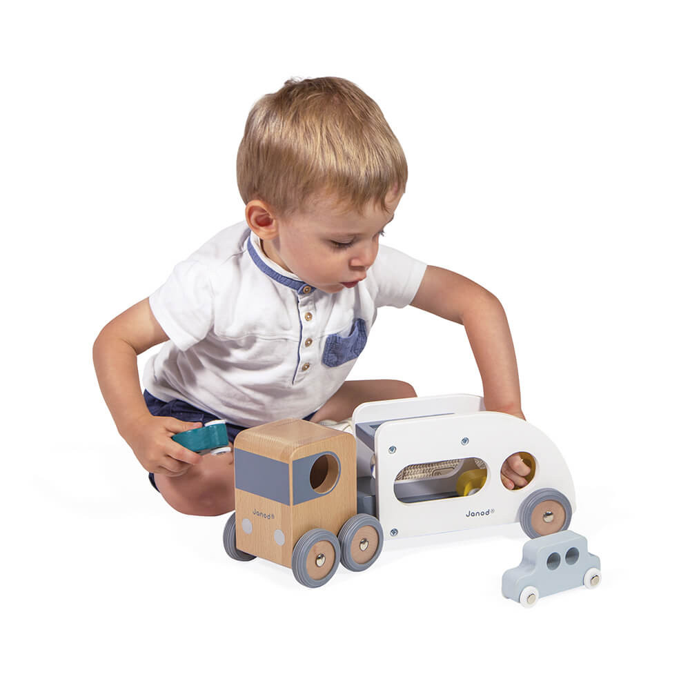 Para os pequenos exploradores que gostam de camiões e carros, este brinquedo é ideal. O camião tem um reboque branco removível e rodas de borracha silenciosas. Inclui três pequenos carros de cores diferentes: azul, verde e amarelo.