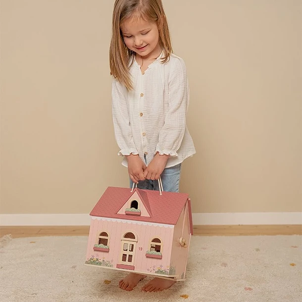 A Casa de Bonecas portátil, em madeira da Little Dutch, é maravilhosa com todos os seus detalhes! Com um fecho de madeira, a casa abre e fecha facilmente, sendo fácil de levar para qualquer lugar graças à sua alça.