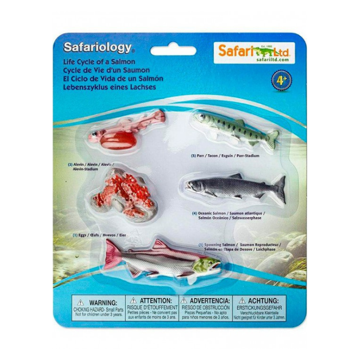 - Conjunto de 5 miniaturas: ovos, alevins, juvenis, salmão e salmão.