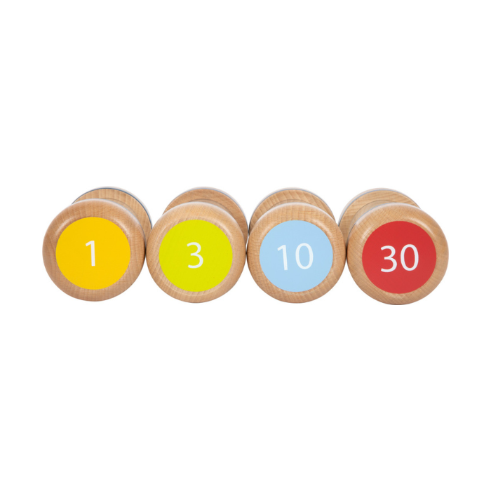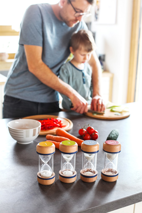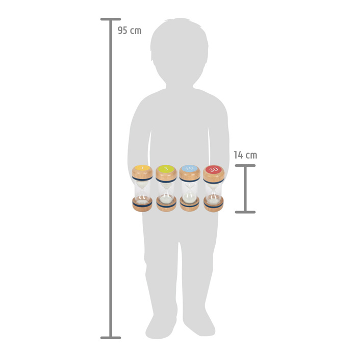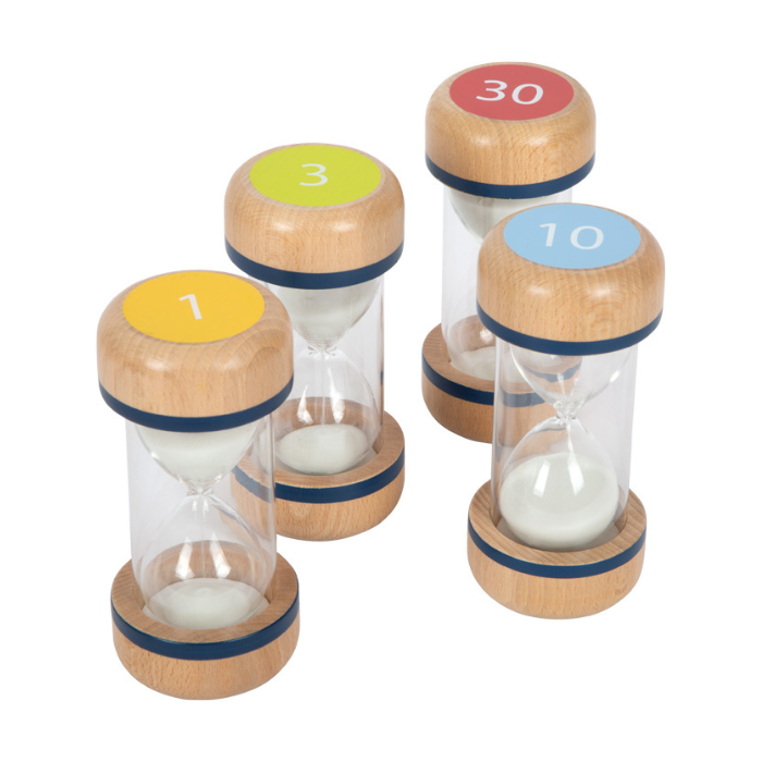 Contém ampulhetas com durações de 1, 3, 10 e 30 minutos [uma de cada], sendo ideal para mãos pequenas devido à sua forma robusta.