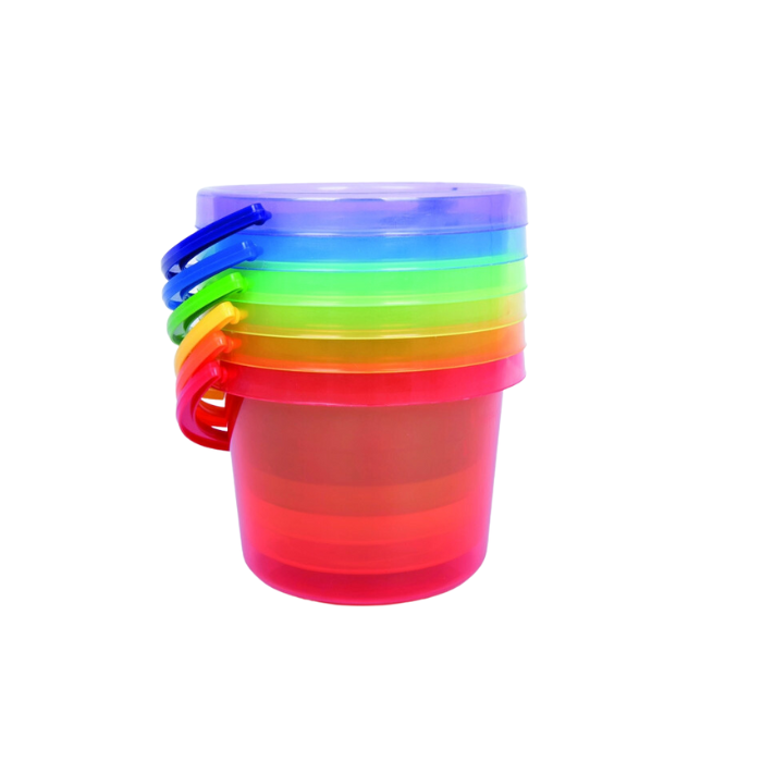 Este conjunto de baldes de cores divertidas empilháveis, têm o tamanho perfeito para os pequenos exploradores usarem em brincadeiras exploratórias com areia e água, para misturar e combinar cores e aprender sobre medição e volume.
