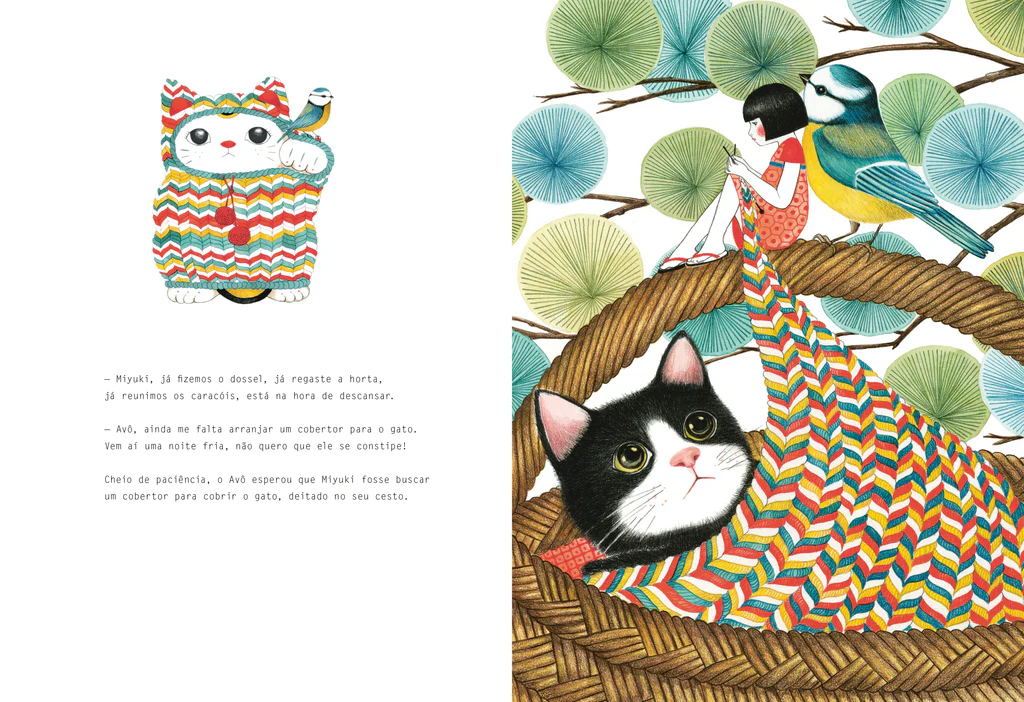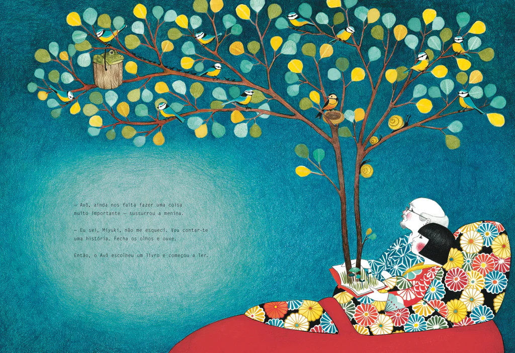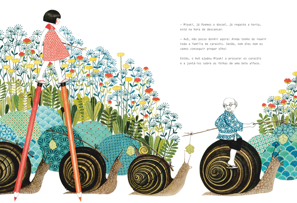 Todas as criaturas do jardim se preparavam para o sono. Só a Miyuki pedia mais um bocadinho de tempo ao Avô. Havia ainda tanto que fazer! Regar a horta, aconchegar o gato, agradecer ao sol... Paciente, o Avô dizia-lhe: "Miyuki, está na hora de descansar."
