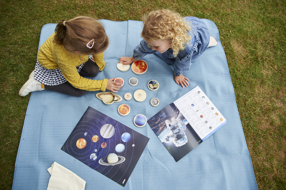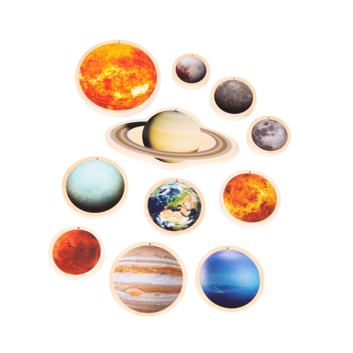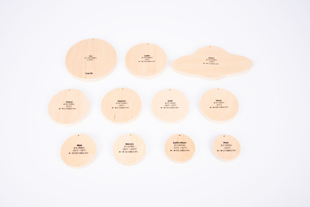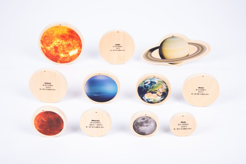 As peças possuem um orifício na parte superior que permite pendurá-los e criar um Sistema Solar móvel. Inclui um poster do sistema solar tamanho A3 , um guia com curiosidades sobre os planetas em 8 línguas e um saco de pano para guardar os blocos.