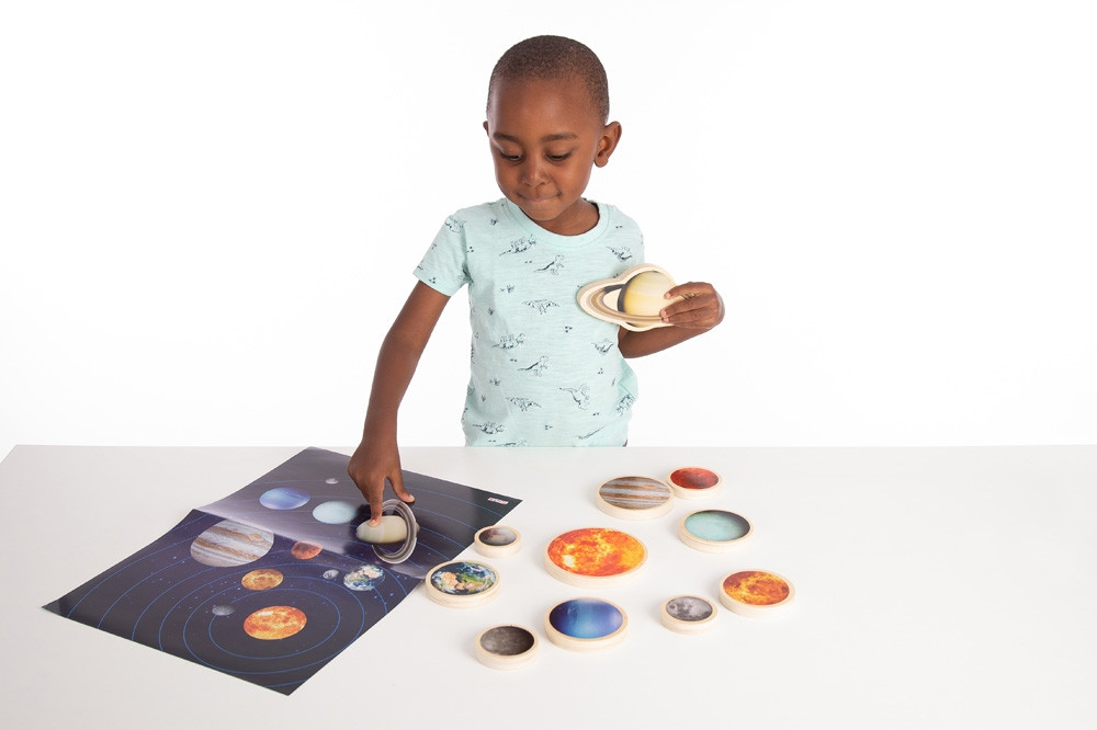 São peças grossas, que ficam em pé, sendo facilmente manuseadas e usadas para inúmeras actividades. Um conjunto que estimula a linguagem descritiva, as habilidades finas, a compreensão do mundo, do sistema solar e do universo. É perfeito para analisar e discutir aspectos relacionados aos planetas: seu tamanho e peso, sua localização no sistema solar, o que é a gravidade...