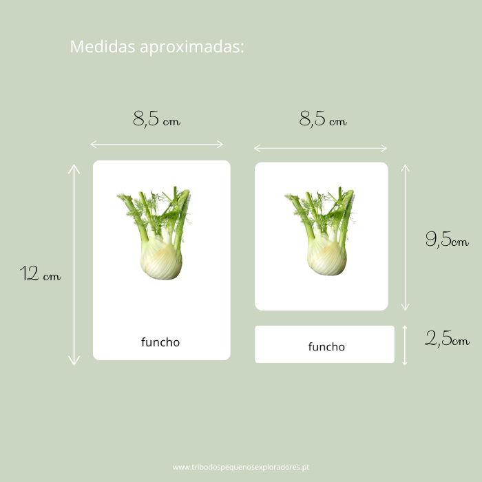 36 Cartões com imagens reais de Vegeitas e Verduras. Cada fruta tem um cartão de 3 partes: cartão controlo, cartão com imagem e cartão com legenda [letra cursiva ou script].