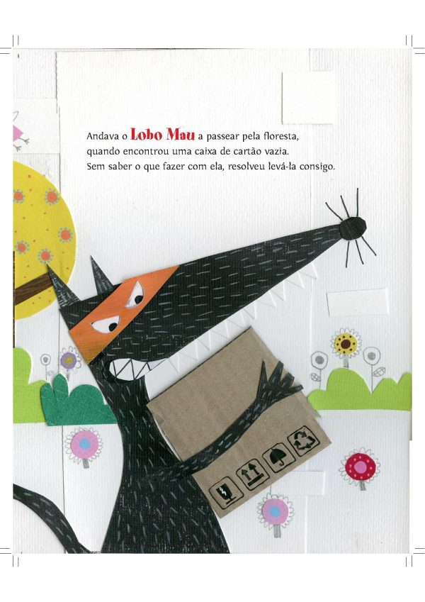 "Andava o Lobo Mau a passear pela floresta, quando encontrou uma caixa de cartão vazia. Sem saber o que fazer com ela, decidiu levá-la. Depois de muito pensar, resolveu fazer uma maldade...".
