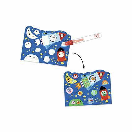 Os pequenos exploradores vão descobrir o que está escondido... para isso basta encher a caneta com água, pintar e a magia acontece! Quando secar, podem começar de novo.