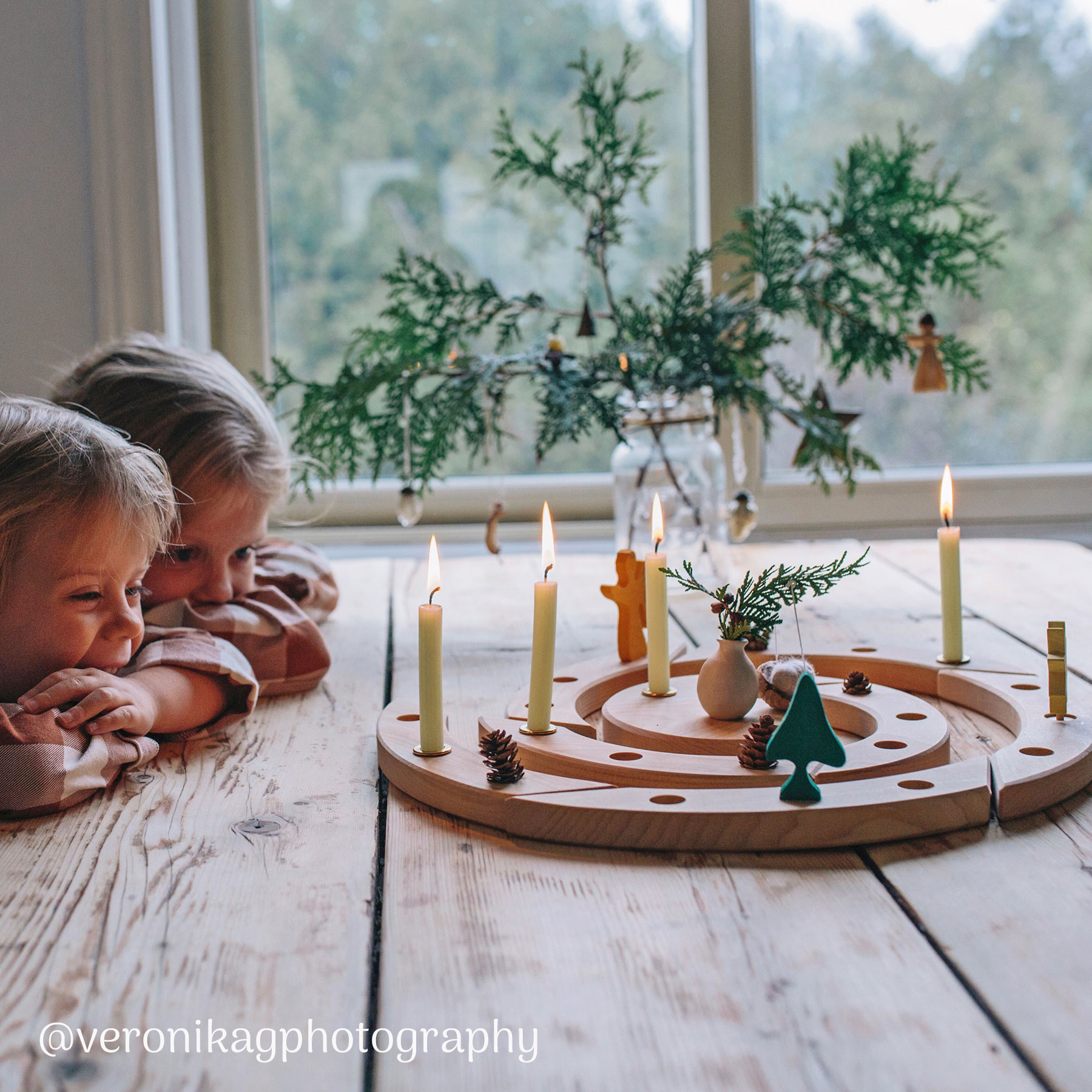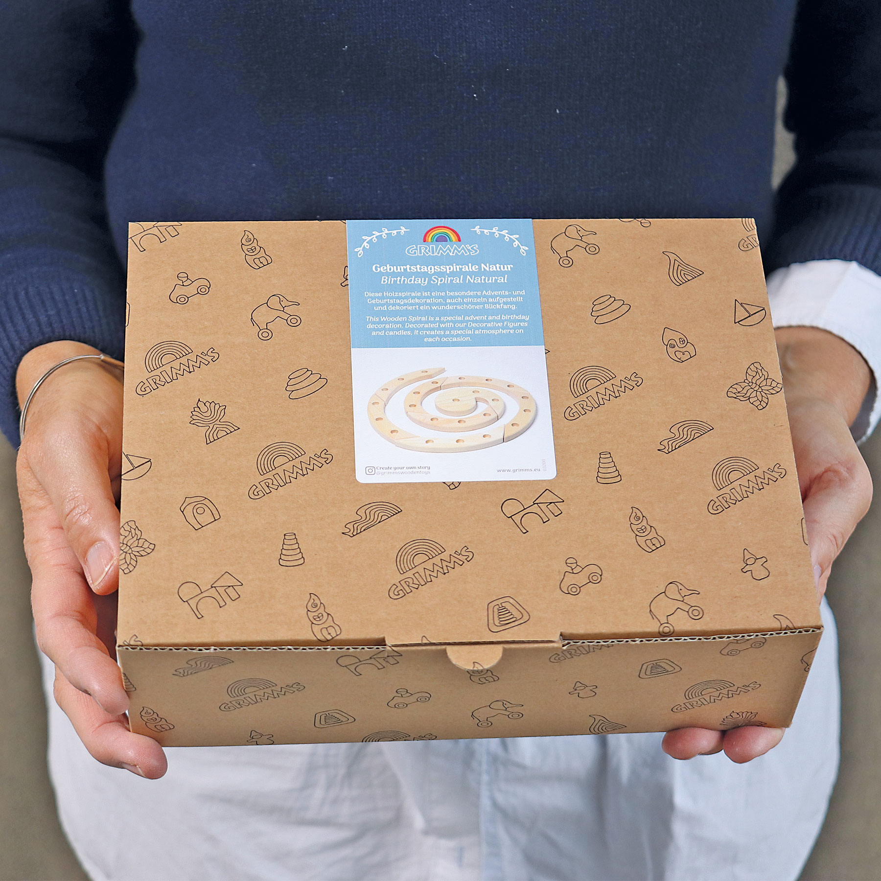 É composto por oito segmentos, com três furos cada, os quais podem ser usados todos juntos, individualmente ou em grupos. A Espiral de Aniversário ou Advento pode ser complementada com outros elementos que são vendidos separadamente, desde velas, números, figuras representativas dos meses do ano ou figuras do calendário de madeira Grimms, por exemplo.