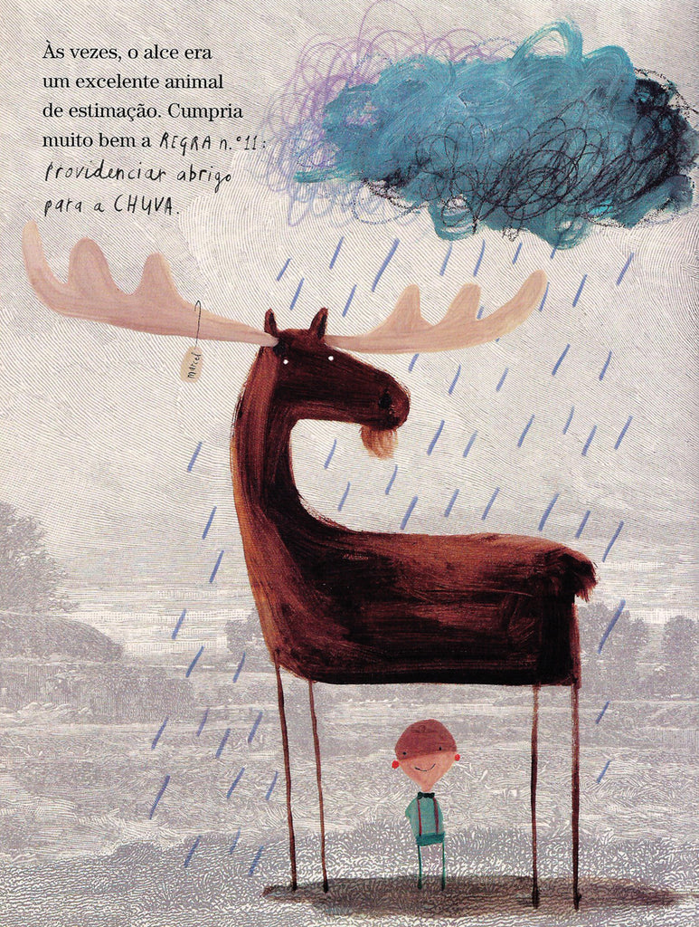 O alce apareceu-lhe certo dia, e o Guilherme percebeu, mas percebeu logo, que aquele alce ia ser seu. Decidiu chamar-lhe Marcel e ensinar-lhe todas as regras que um bom animal de estimação deve conhecer. Regra n.º 7: NÃO SE AFASTAR MUITO DE CASA. Regra n.º 11: PROVIDENCIAR ABRIGO PARA A CHUVA. Mas o obstinado Marcel, com o seu especial apetite por maçãs, não estava nada para aí virado…