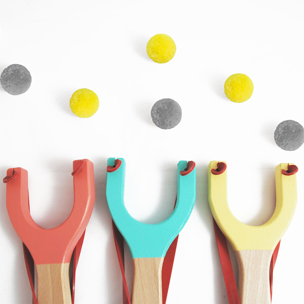 - Contém: uma fisga em madeira e dois pompons [de cor aleatória].