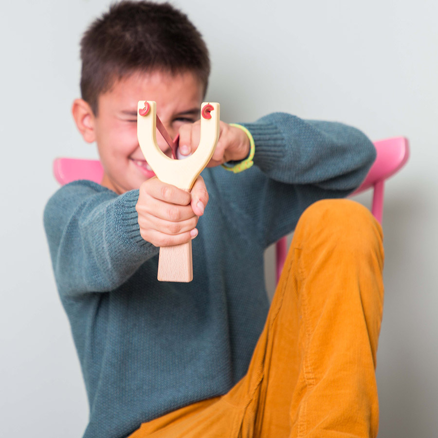 Esta fisga, feita em madeira natural e de forma tradicional, inclui 2 pompons super fofinhos para que todos se divirtam sem perigo.