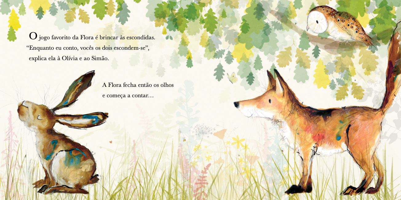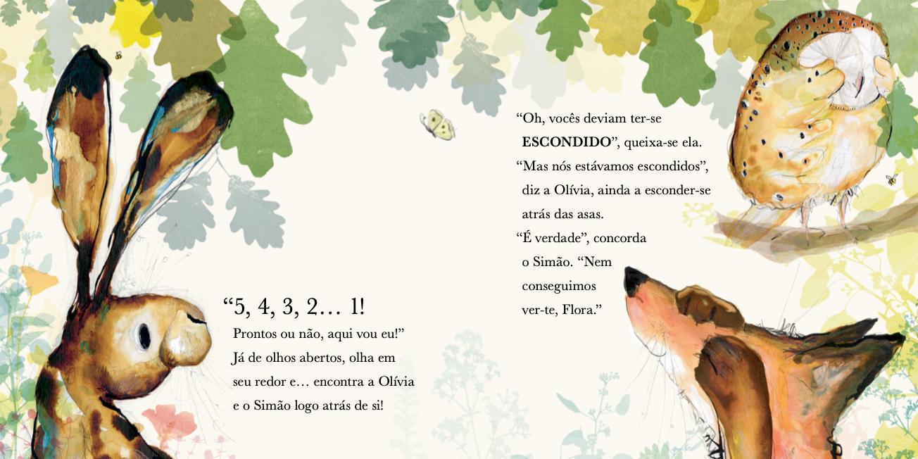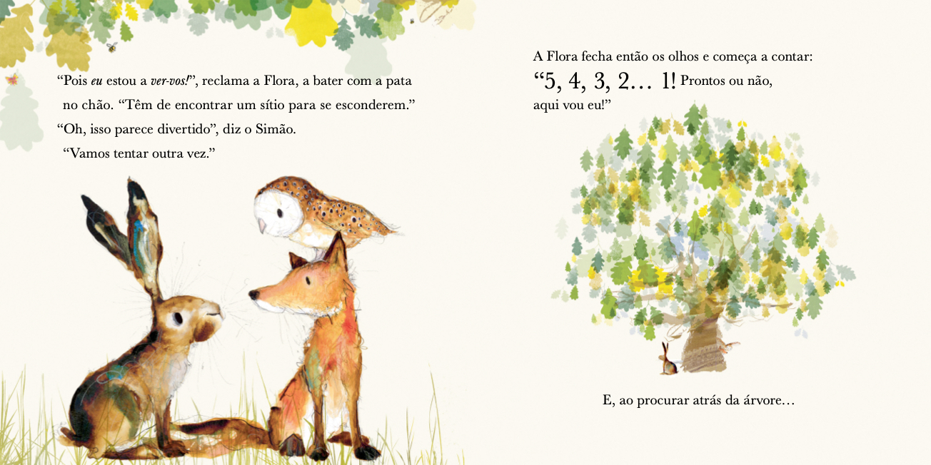 “Enquanto eu conto, vocês os dois escondem-se”, diz ela à Olívia, a coruja, e ao Simão, o raposo. Ela fecha então os olhos e conta: “5, 4, 3, 2... 1! Prontos ou não, aqui vou eu!”. Mas, assim que abre os olhos, encontra-os imediatamente. Pede depois repetidamente aos amigos que se escondam como deve ser.