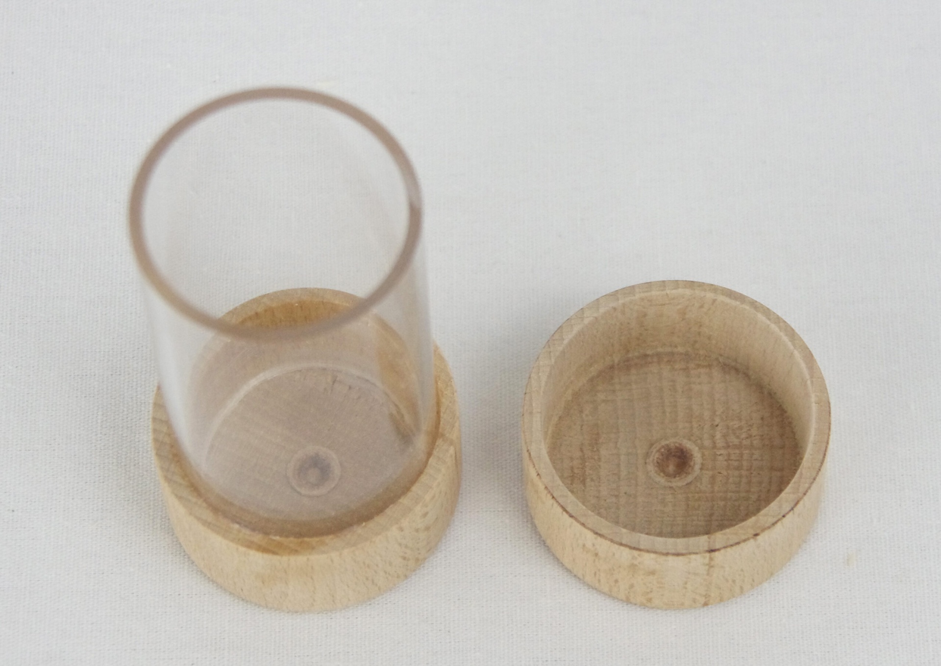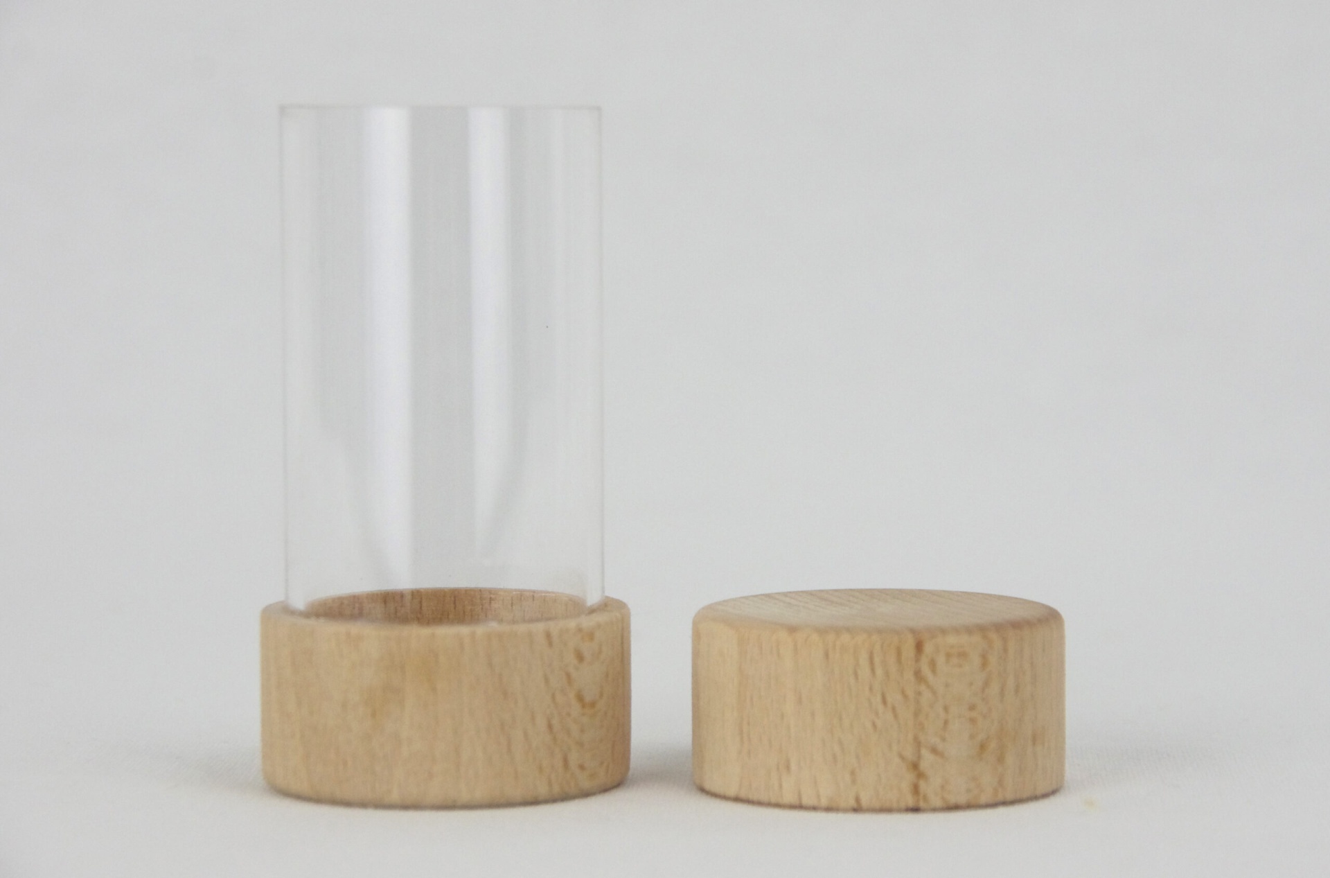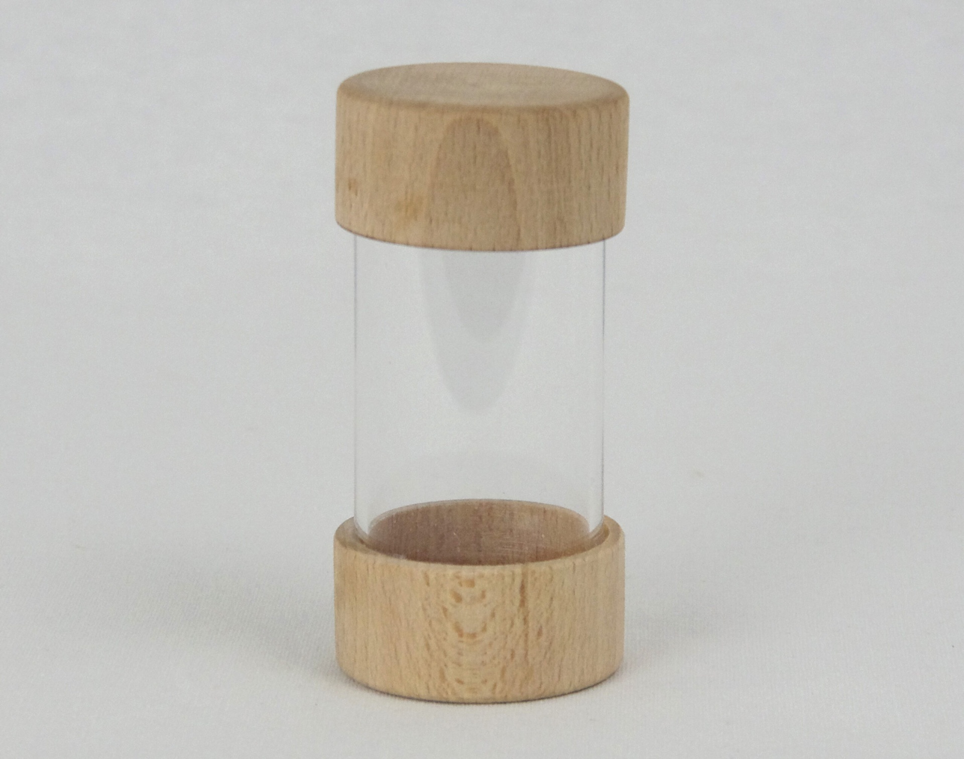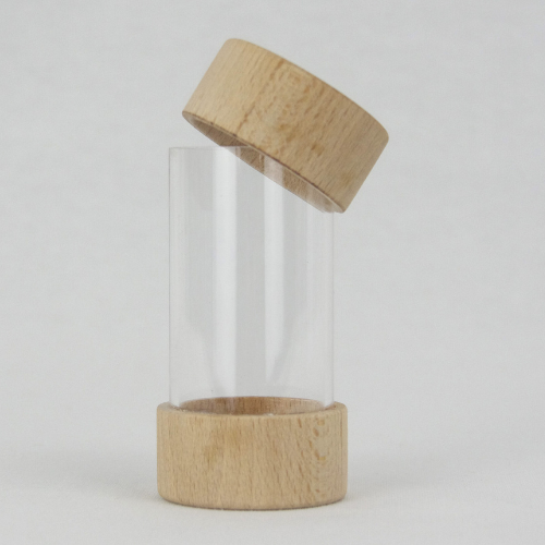 Este frasco transparente, com duas tampas em madeira e acabamento natural, é ideal para manipular e observar.