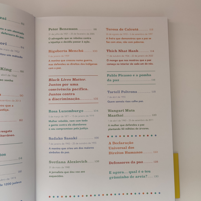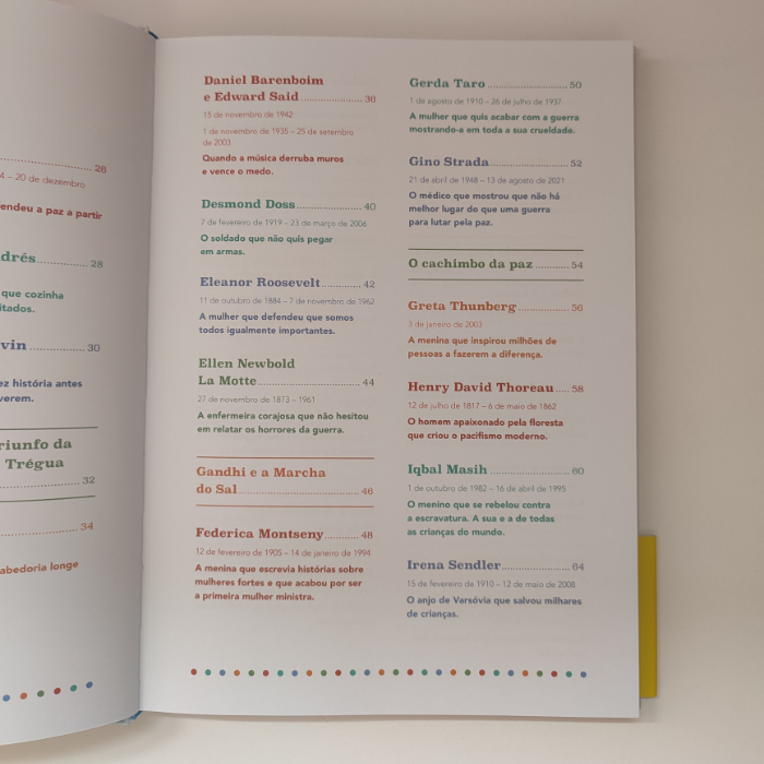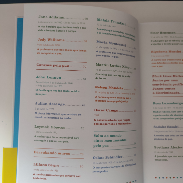Aristides de Sousa Mendes, Eleanor Roosevelt, Malala Yousafzai, John Lennon, Martin Luther King, Dalai Lama, Maria Montessori, Iqbal Masih, Henry David Thoreau, Oskar Schindler… e muitos mais!