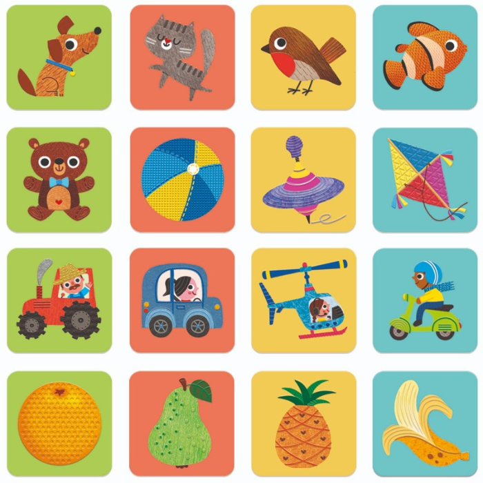 Descobre as peças, toca-lhes e forma os pares! Este jogo de memória estimula a sensibilidade tátil e a lógica dos mais pequenos exploradores.