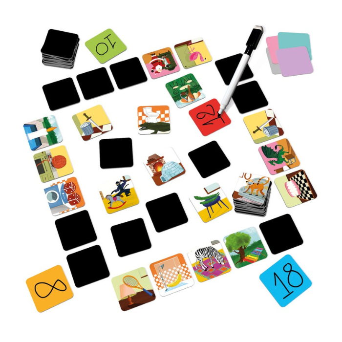 - Contém: 40 cartões; 8 cartas de pontuação coloridas; 1 marcador apagável; regras de jogo.
