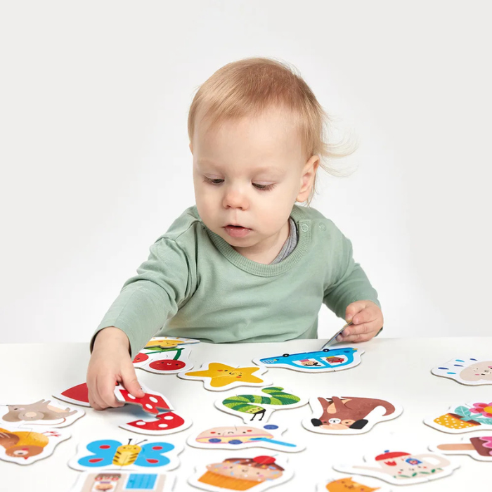 Este conjunto inclui dezanove puzzles, de duas peças cada, que promovem a observação, o pensamento lógico e a coordenação motora, de forma divertida e simples.