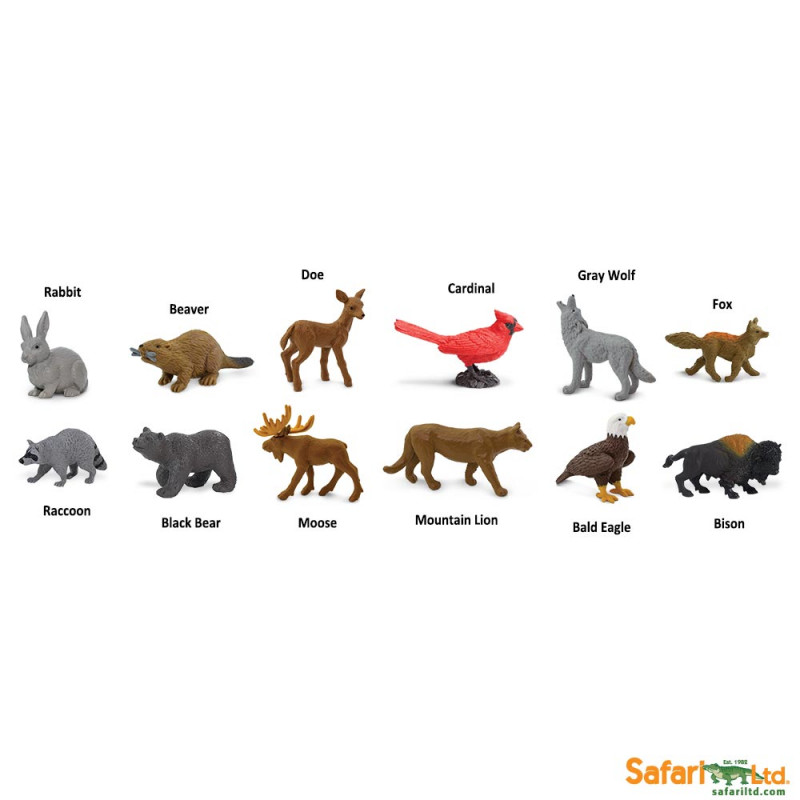 - Inclui: coelho, castor, gamo, cardeal, lobo cinzento, raposa, guaxinim, urso preto, alce, leão da montanha, águia americana e bisonte.