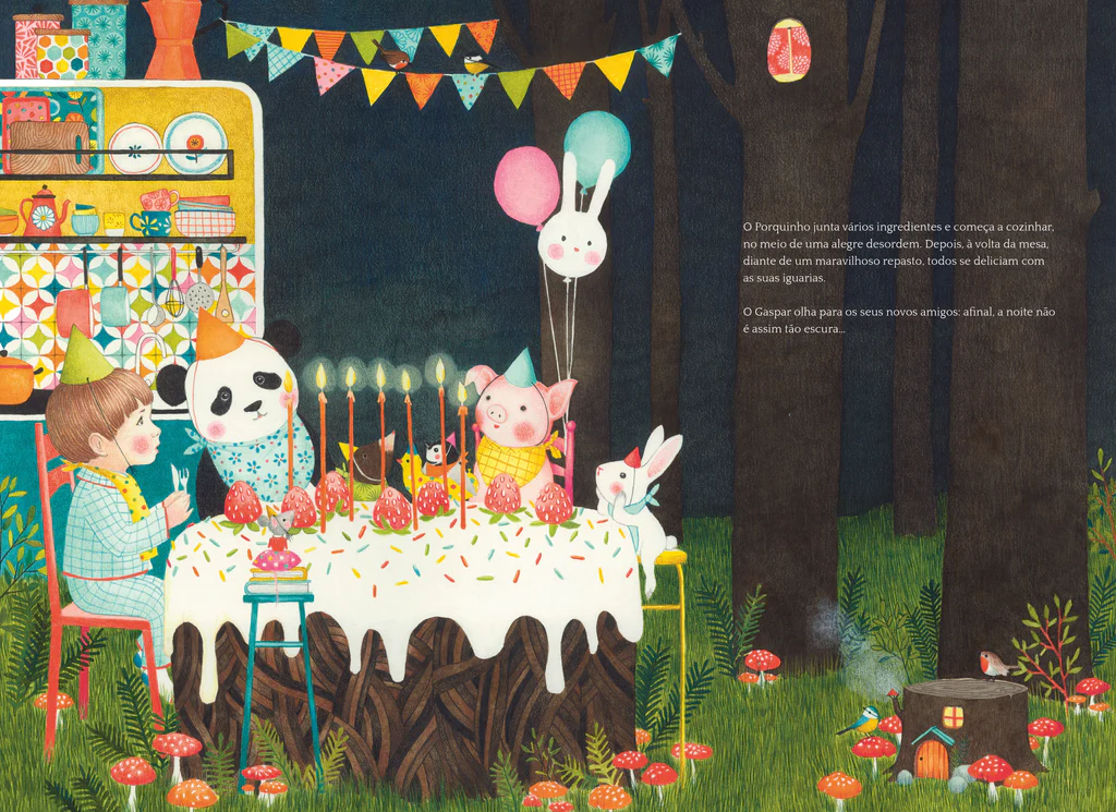 Então, o Gaspar fica acordado, a pensar como seria bom ter ali um amigo. De súbito, ouve uma vozinha: Olá! Chamaste-me? O Gaspar nem quer acreditar! Não querias um amigo? Vem comigo, vamos à procura. Afinal, o Gaspar não está sozinho e à noite fazem-se bons amigos!