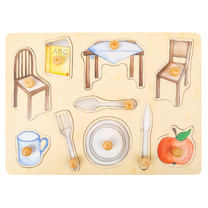 Vamos conhecer os diferentes objectos do dia-a-dia? Este puzzle com pegas em madeira, é indicado para as mãos mais pequeninas.