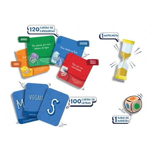 - Contém: 1 dado de madeira, 1 ampulheta, 100 cartas de letras e 120 cartas de categorias.