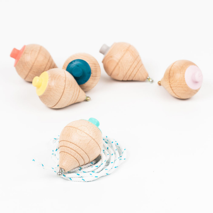 Quem se lembra do jogo do pião? Este é um pião de madeira, tal e qual os tradicionais, com um design mais moderno e cores que os pequenos exploradores vão adorar!