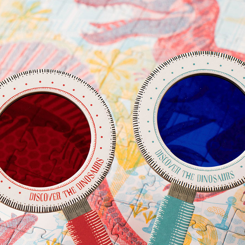 Os pequenos exploradores vão olhar através da lupa azul e descobrir impressionantes Tiranossauros Rex, diplodocos e espinossauros a andar no meio de vulcões. Depois, pode olhar através da lupa vermelha e descobrir como os ossos fossilizados desses gigantes se tornaram parte do museu de ciências naturais.