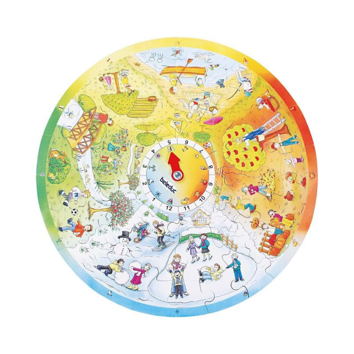 Quebra-cabeça redondo de madeira com ilustrações e relógio analógico ao centro
