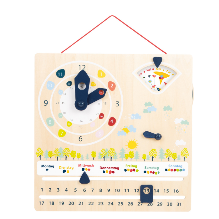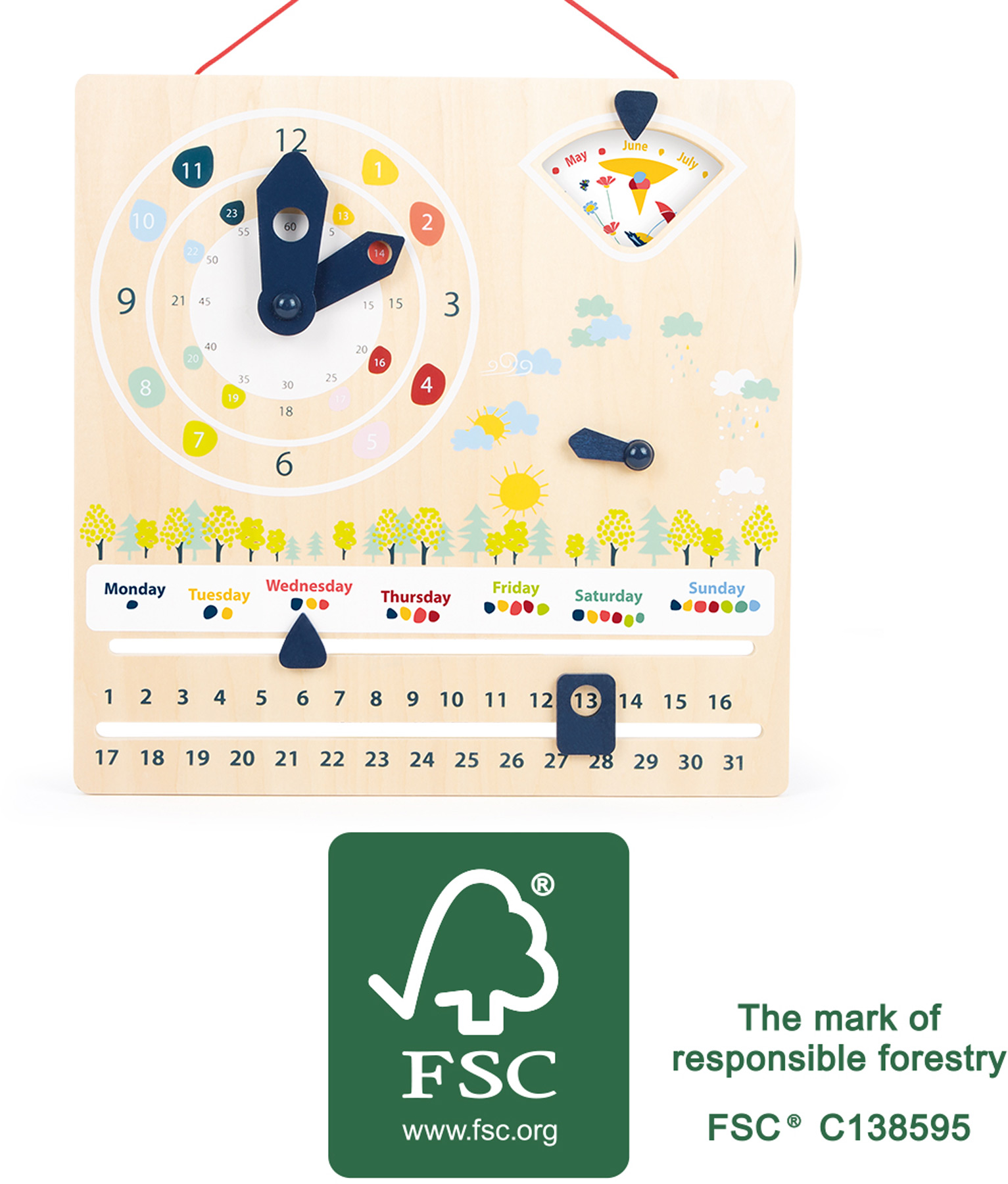 Será um calendário ou um relógio? Ambos! Os pequenos exploradores vão poder aprender a contar o tempo de 12 e 24 horas, ao mesmo tempo que aprendem o clima, os dias da semana, os meses e as estações do ano de forma simples e lúdica.