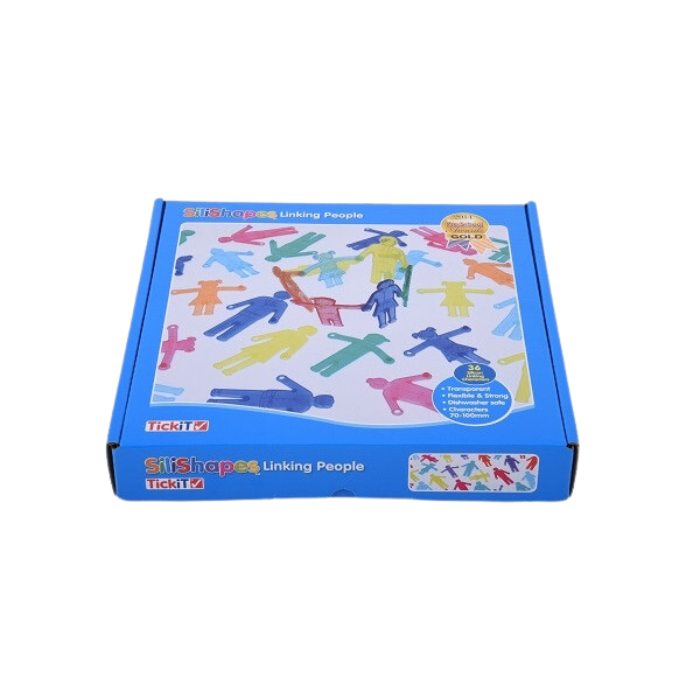 Um conjunto de 36 bonecos de silicone de cores translúcidas, perfeitos para utilizar nas mesas de luz. Inclui seis famílias, de diferentes cores, compostas por seis membros [filho, filha, pai, mãe, avó e avô] que podem ser unidos através das mãos.