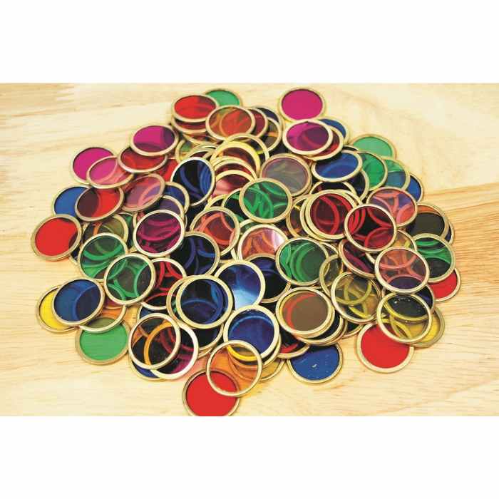 Um conjunto de 100 discos transparentes coloridos com aros de metal ideais para uso com imãs. Podem contar, classificar, usar numa mesa de luz ou em actividades sensoriais... a imaginação dos pequenos exploradores vai andar à solta.