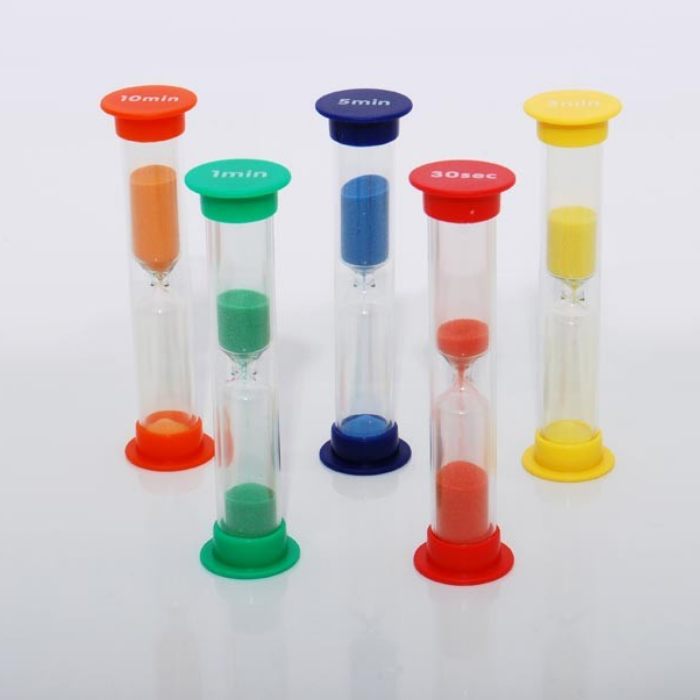 O conjunto contém um temporizador de areia de cada: 30 segundos, 1 min, 3 min, 5 min e 10 min.