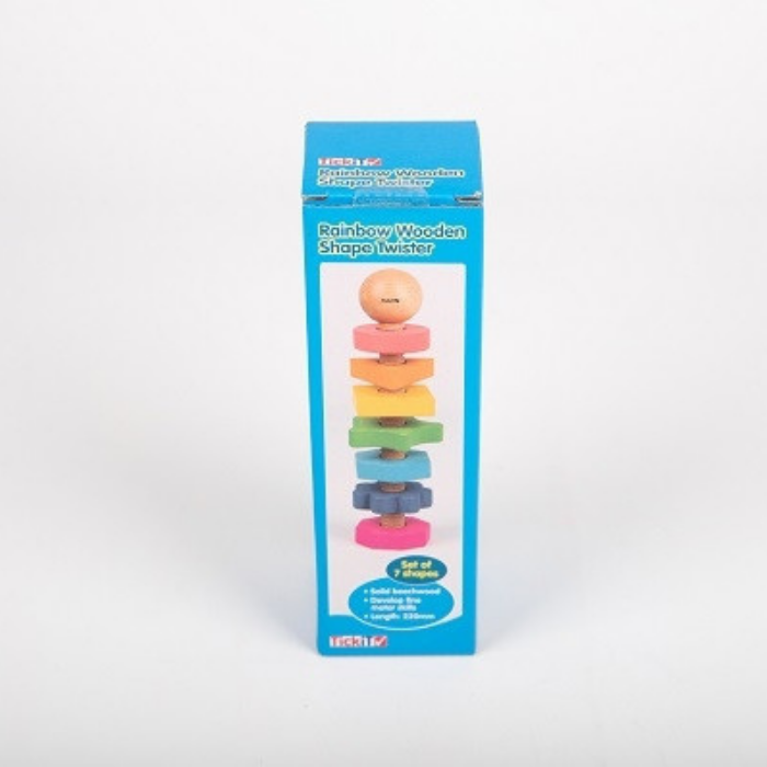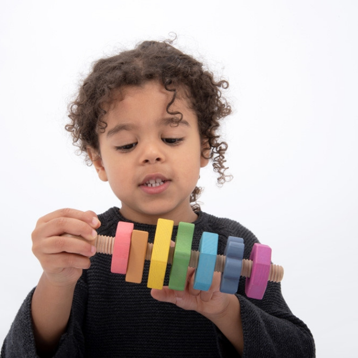 Este parafuso gigante, em faia maciça, com sete formas diferentes nas cores do arco-íris é ideal para as mãos mais pequeninas. Cada formato tem um número diferente de arestas, aumentando de 1 (círculo) a 8 (octógono). As peças volumosas têm o tamanho ideal para as crianças manipularem e um acabamento natural para mostrar o veio da madeira.