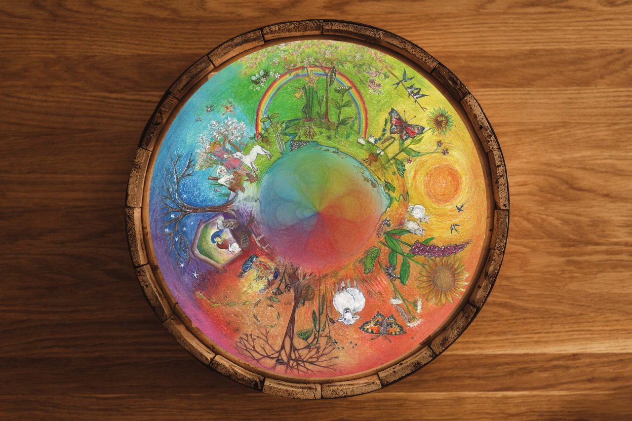 Esta deslumbrante roda, de madeira ilustrada, remete-nos para os ciclos de vida que estão ao nosso redor, eles são parte do nosso mundo natural e parte de todos os seres vivos.