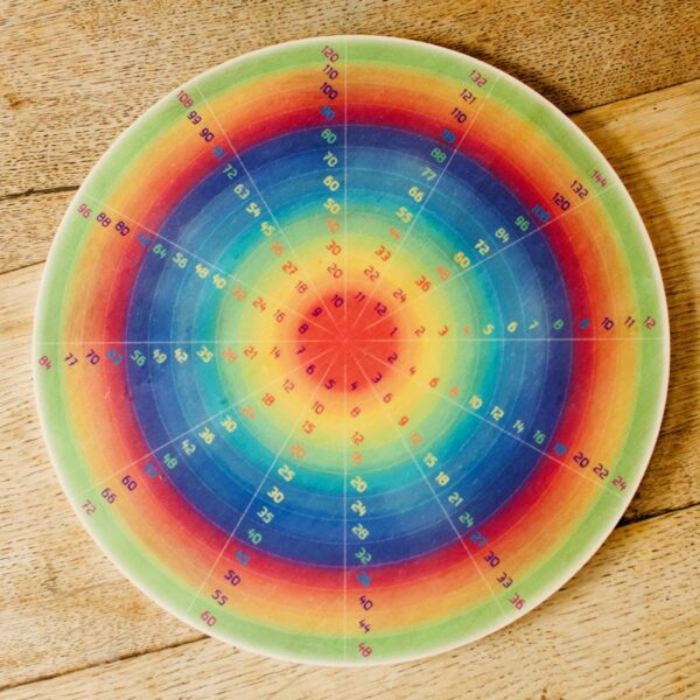 A roda de multiplicação é versátil e resistente, incentivando as crianças a identificar os padrões nas tabuadas. Simultaneamente, é uma aprendizagem multissensorial através das suas cores, texturas, sons e muito mais, atribuindo uma forma física ao conceito abstrato de "matemática".